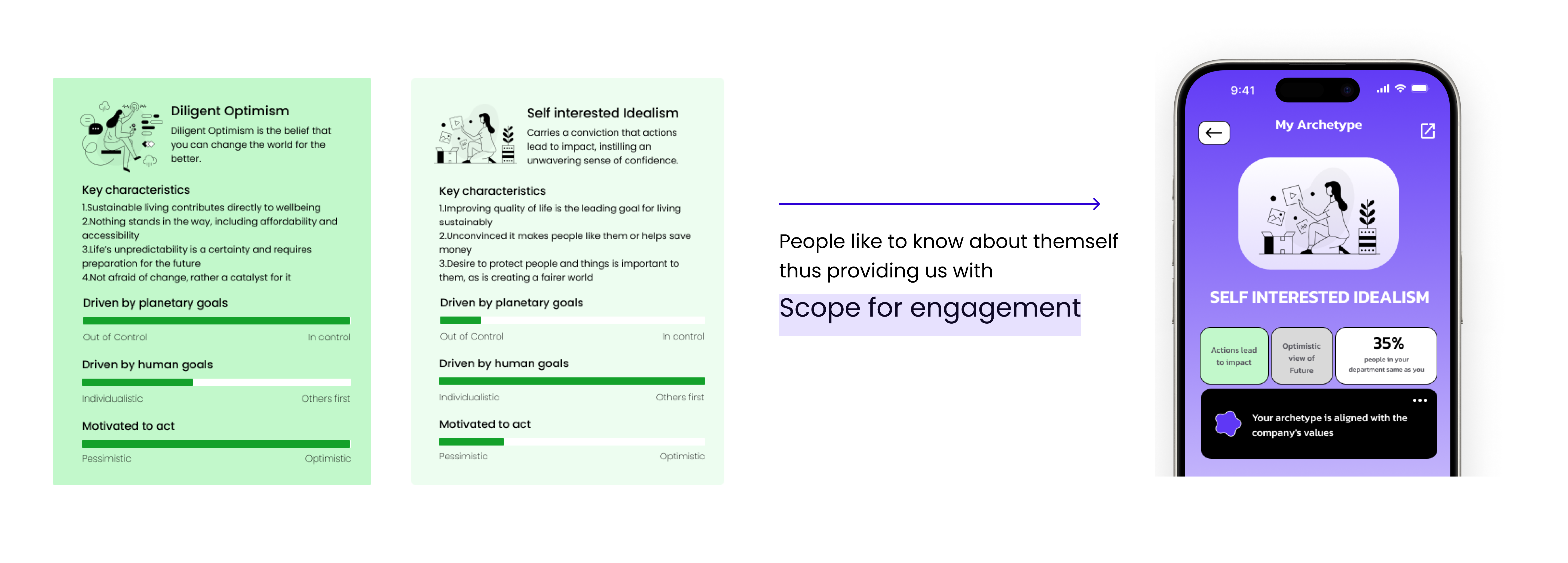 So in this project we tried to align user’ s personal values of future outlook and living sustainably with the organization’s values to make the process more personalized and relatable
