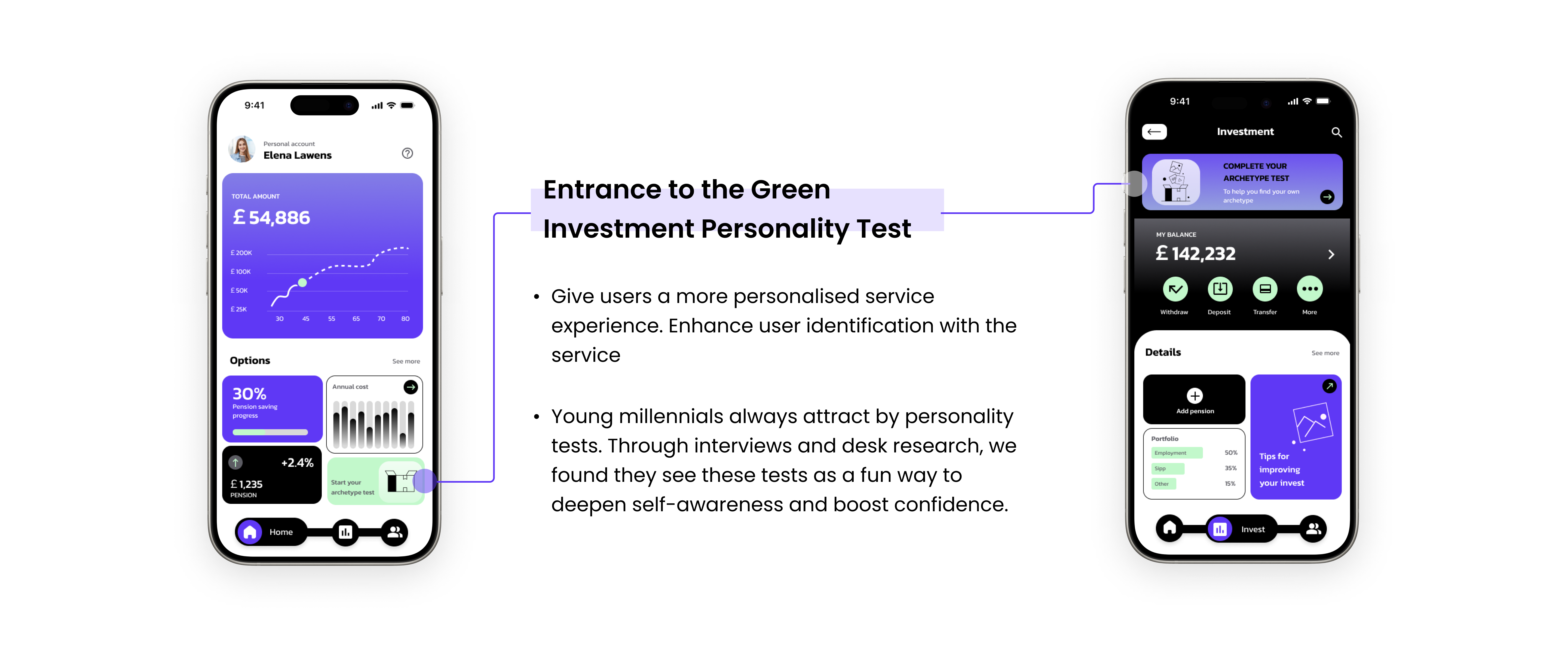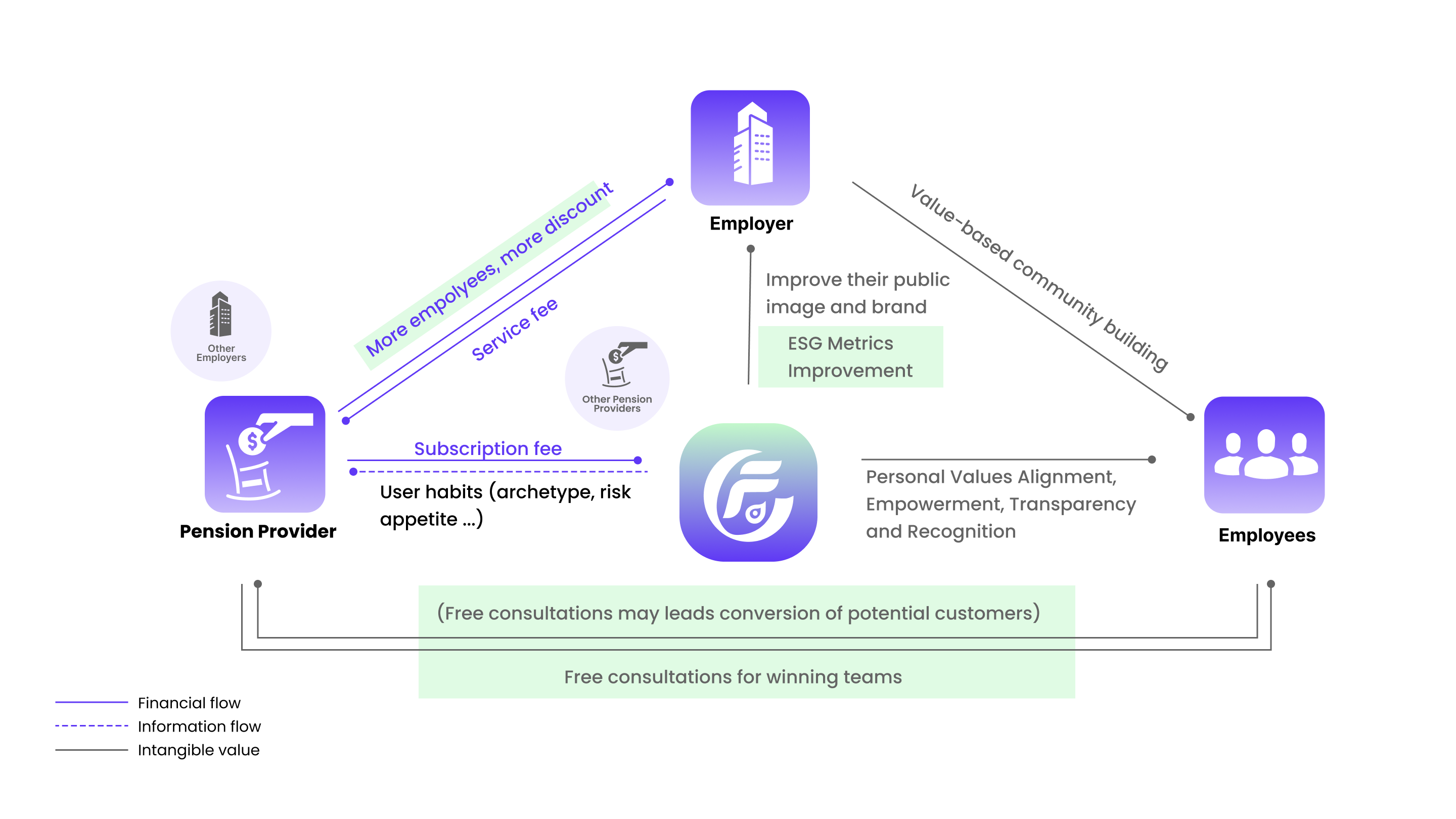 The new service, named Fingon, aimed to increase employee engagement with their pensions by aligning their values of sustainability with their workplace's values. This alignment was achieved through a set of questions that determined each employee's archetype, which was then matched to the company's values to identify three common values. Based on these values, Fingon suggested suitable funds, offering options for low-risk, high-return investments to show potential gains, thus providing employees with greater control and transparency.The service also used nudges, such as team recognition and peer influence, to encourage investment in green funds.